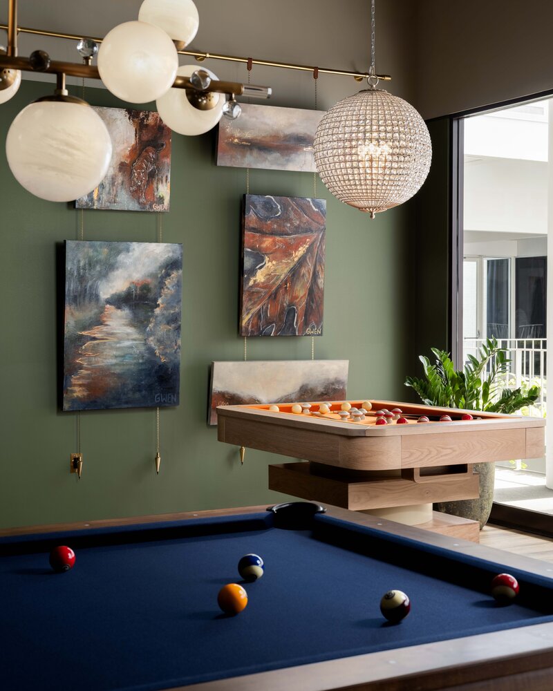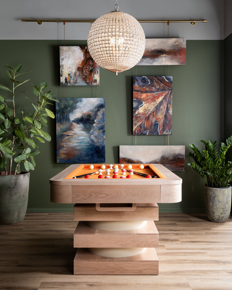 In front of our Fall 2025 Guest Artist, Emily Gwen’s paintings—rooted in nature and layered with texture—you’ll find the Harper Bumper Pool Table. Its architectural silhouette in hand-finished white oak complements Gwen’s palette, merging function and artistry into one cohesive focal point.